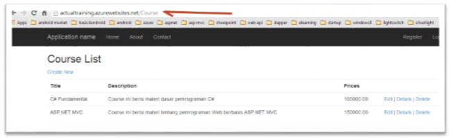 9. Setelah aplikasi anda berhasil dipublish di Windows Azure, coba untuk akses url http://<url_app_anda>/Course untuk menampilkan daftar Course.