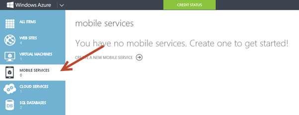 1. Buka Windows Azure manajemen portal, kemudian pilih Mobile Services.