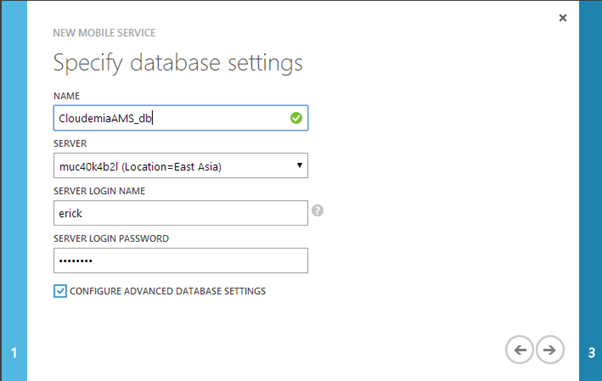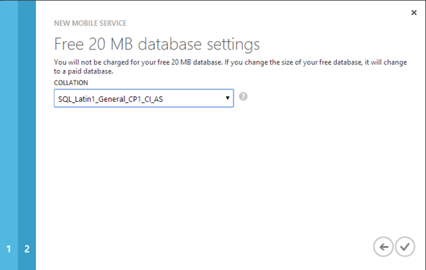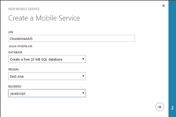 2. Tambahkan new mobile service baru dengan detail sebagai berikut (untuk penamaan anda dapat menentukan nama sendiri). Anda dapat memilih free 20mb database yang disediakan oleh Azure.