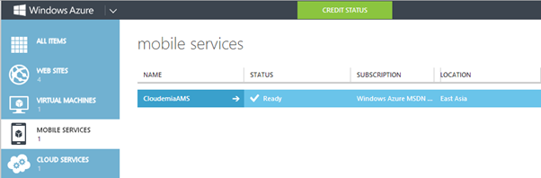 4. Setelah selesai maka anda dapat melihat azure mobile services baru dengan nama CloudemiaAMS.