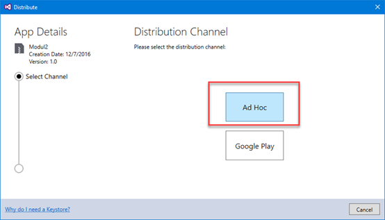 3. Setelah selesai pilih tombol Distribute untuk mendistribusikan .apk yang akan dibuat. Ada dua pilihan yaitu Ad Hoc dan Google Play. Pilih Ad Hoc untuk mendistribusikan .apk tanpa melalui google play.