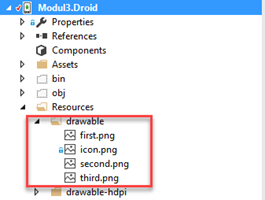 8. Untuk menambahkan image yang akan ditampilkan, tambahkan image yang akan ditampilkan kedalam project Droid (untuk aplikasi android) di folder Resources\drawable. Pada contoh berikut ditambahkan tiga file bertipe .png kedalam folder tersebut. Anda dapat download asset tersebut disini