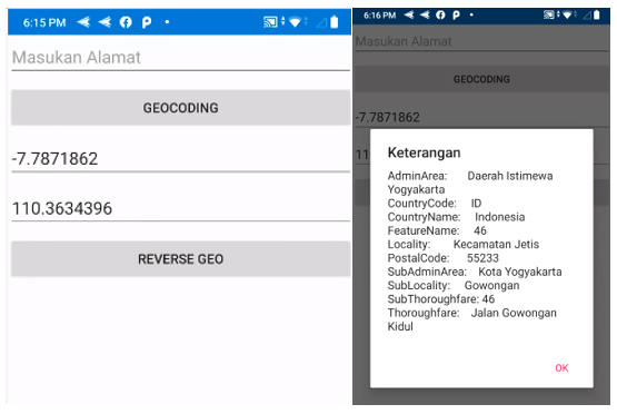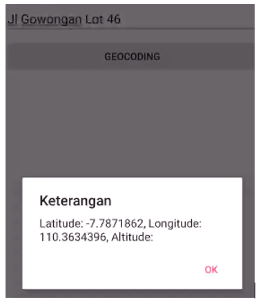 3. Kemudian jalankan aplikasi dan ketikan alamat tertentu, maka akan ditampilkan posisi latitude dan longitude dari alamat tersebut.