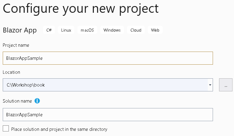 2. Kemudian pilih Blazor App, masukan BlazorAppSample sebagai nama project