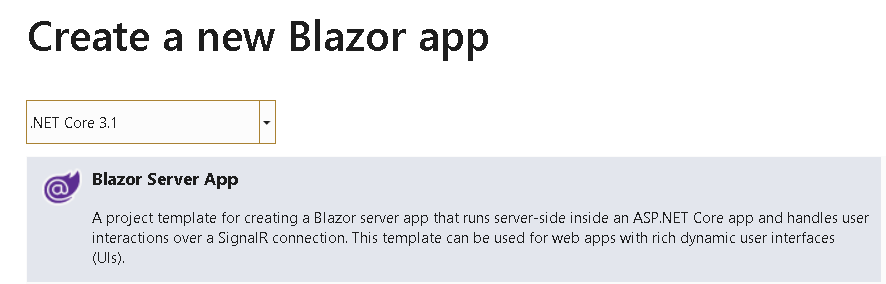 3. Kemudian pilih Blazor Server, dan pilih .NET Core 3.1