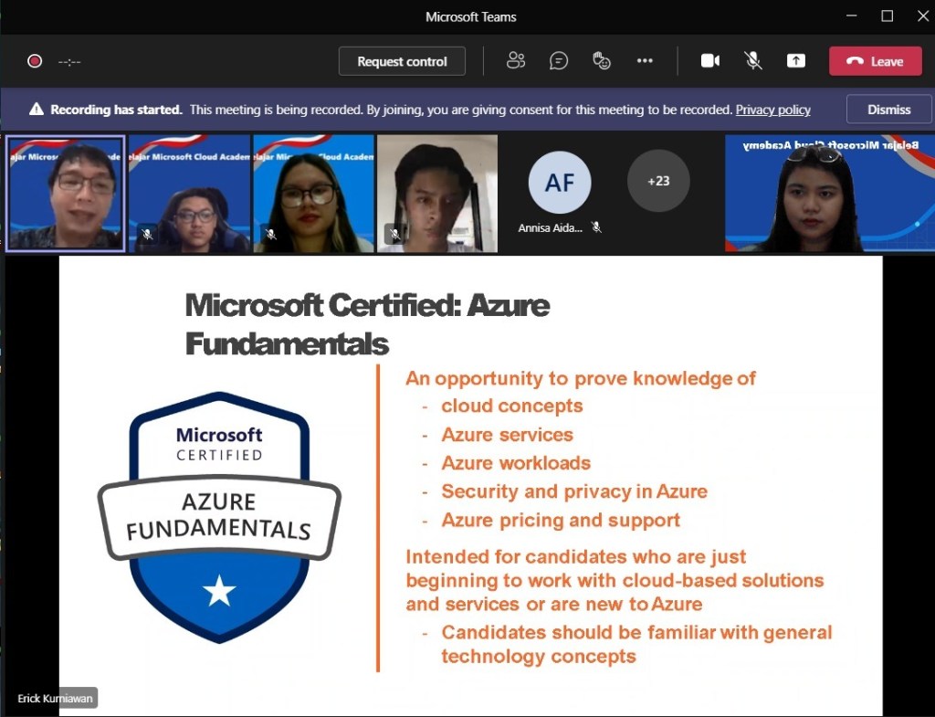 Salah satu program dari Indonesia Belajar Microsoft Cloud adalah mentoring dan sertifikasi. Pada program ini saya berkesempatan untuk berperan sebagai mentor yang memberikan bimbingan dan berbagi pengalaman dalam mengambil sertifikasi di bidang Microsoft Azure. Bimbingan mentor tersebut dilaksanakan pada tanggal 25 November 2021 melalui Microsoft Teams. Program mentoring ini dilaksanakan selama kurang lebih 2 bulan, dari bulan November 2021.