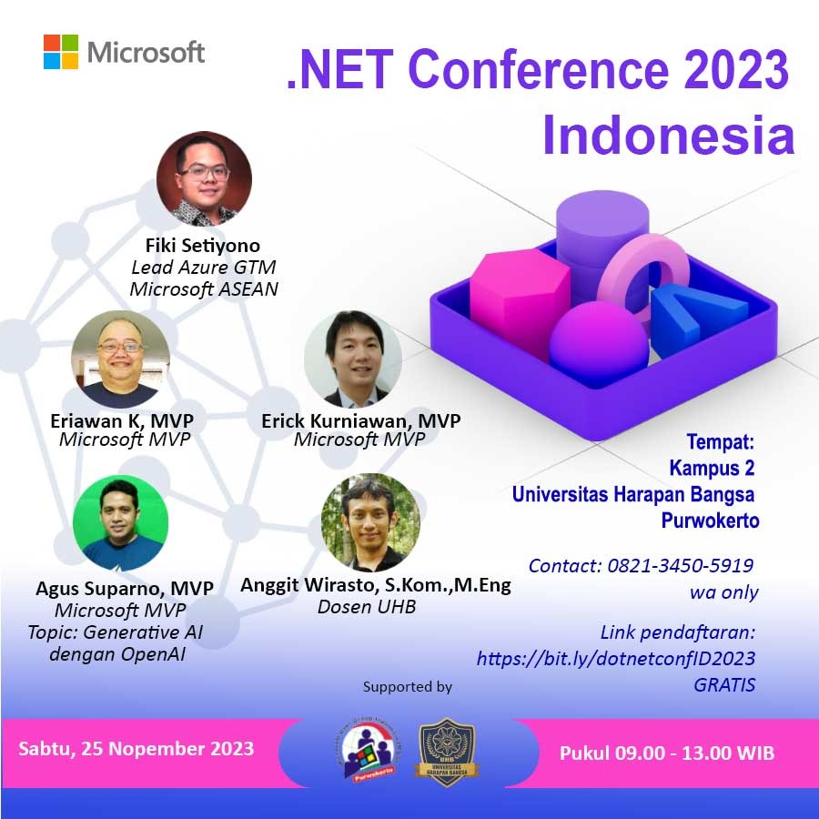 Pada tanggal 25 November 2023, telah dilangsungkan acara .NET Conference 2023 Region Indonesia di Universitas Harapan Bangsa, Purwokerto Indonesia. Acara .NET Conf 2023 ini didukung oleh komunitas Microsoft User Group Indonesia (MUGI) dan Microsoft Indonesia. Acar ini adalah konferensi yang diselenggarakan untuk merayakan perilisan .NET 8. Acara ini diikuti oleh kurang lebih 50 orang peserta secara offline dan online.