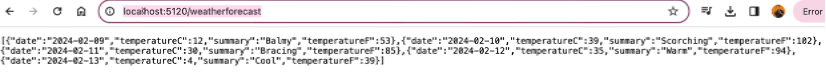 6. Akses url http://localhost:<port>/weatherforecast, maka hasilnya dapat dilihat sebagai berikut: