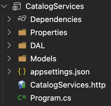 Buat project web api dengan nama CatalogServices. kemudian tambahkan folder Models dan folder DAL pada project.