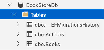 Buka Azure Data Studio, kemudian koneksikan ke database BookStoreDb. Berikut adalah database dan tabel yang berhasil dibuat menggunakan perintah migrations.