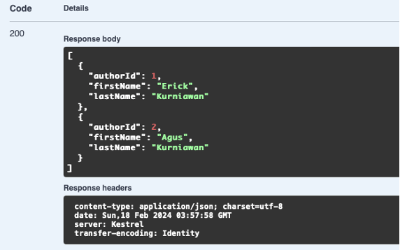 Alamat endpoint dari API juga langsung dituliskan pada method MapGet() “api/v1/authors”.
