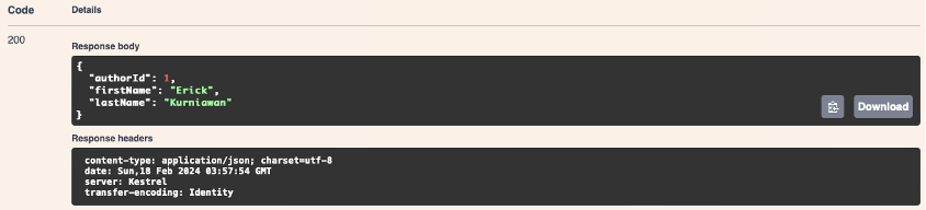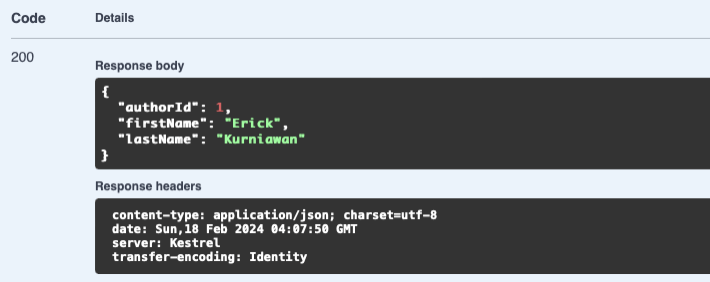 Method diatas akan menerima parameter id dan mengembalikan satu data author sesuai dengan id yang diinputkan. Jalankan web api kemudian lakukan tes pada API yang sudah dibuat.