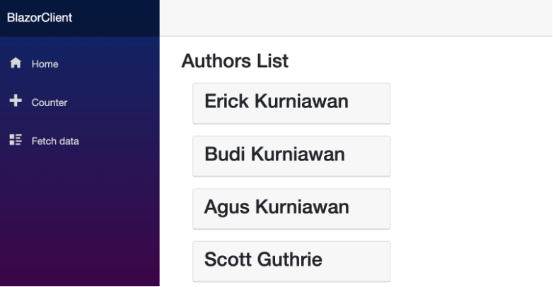 Kode diatas digunakan untuk menampilkan semua data Author yang diperoleh dari Author API. Jalankan aplikasi Blazor Client tersebut dan tampilkan halaman /authorpage, maka dapat dilihat hasil sebagai berikut: