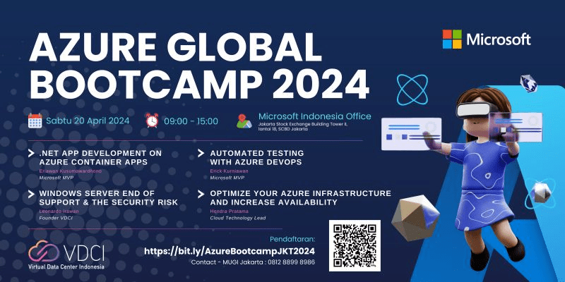 Pada hari sabtu, tanggal 20 April 2024, telah dilangsungkan acara Azure Global Bootcamp 2024 Region Indonesia yang dilaksanakan di kantor Microsoft Indonesia Jakarta. Acara Azure Global Bootcamp 2024 ini didukung oleh komunitas Microsoft User Group Indonesia (MUGI) Region Jakarta dan Microsoft Indonesia. Acara ini diikuti oleh kurang lebih 100 orang peserta secara offline dan online.
