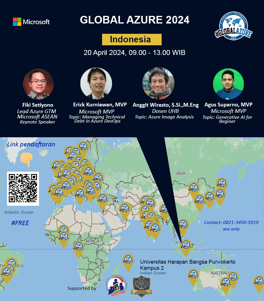 Pada hari sabtu, tanggal 20 April 2024, telah dilangsungkan acara Global Azure 2024 Region Indonesia yang dilaksanakan secara offline di Universitas Harapan Bangsa Purwokerto, dan juga dilaksanakan secara online melalui MS Teams. Acara Global Azure 2024 ini didukung oleh komunitas Microsoft User Group Indonesia (MUGI) Region Purwokerto dan Microsoft Indonesia. Acara ini diikuti oleh kurang lebih 75 orang peserta secara offline dan online.