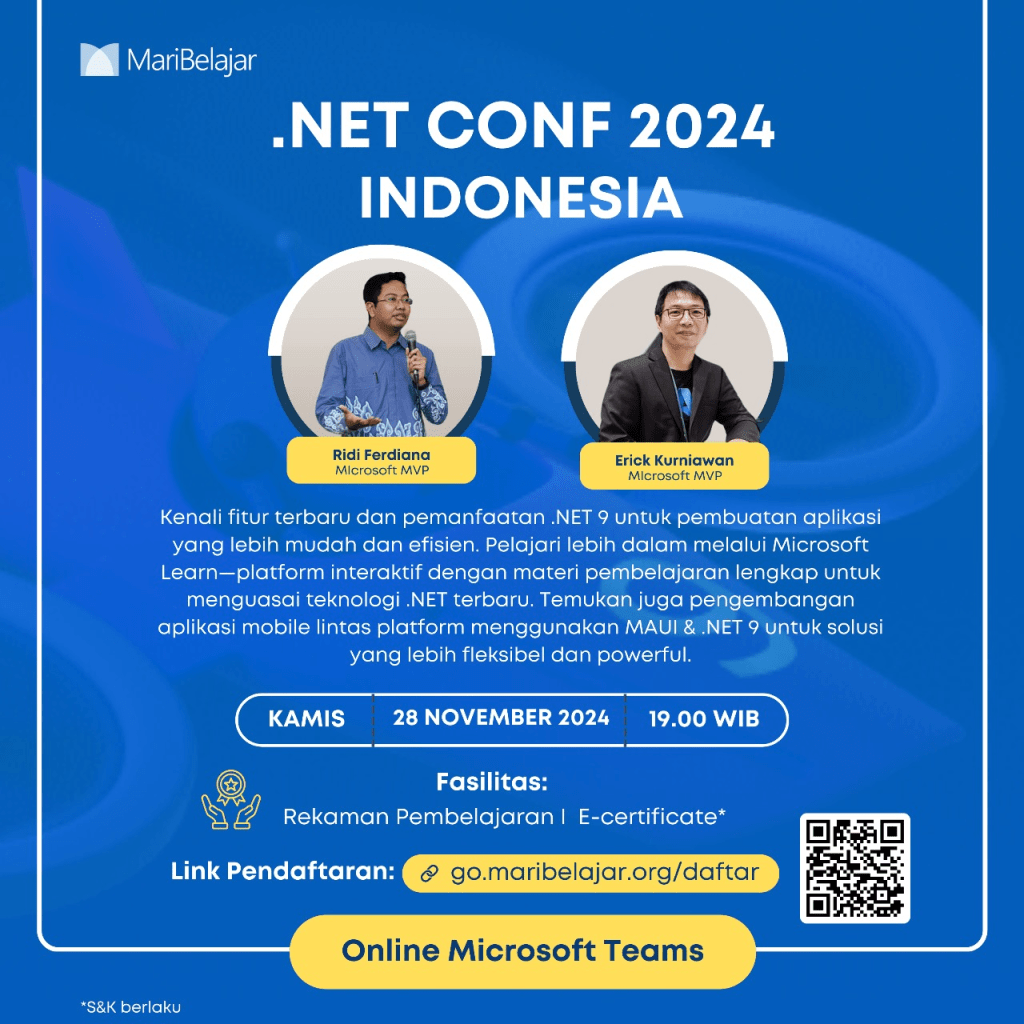 Pada hari Kamis, tanggal 28 November 2024 telah dilangsungkan acara .NET Conf 2024 yang diselenggarakan oleh komunitas MariBelajar – Yogyakarta. Acara .NET Conf 2024 ini diselenggarakan secara online melalui media Microsoft Teams. Acara ini diikuti oleh lebih dari 100 orang peserta.