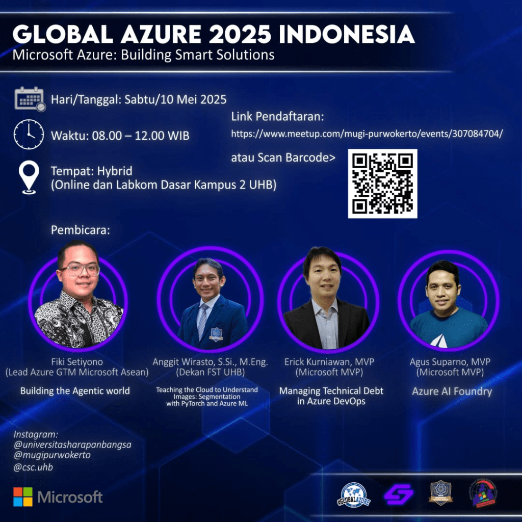 Pada event ini hadir Pak Fiki Setiyono dari Microsoft Indonesia sebagai keynote speaker dengan topik Building Agentic World. Saya sendiri berkesempatan untuk membawakan topik Managing Technical Debt in Azure DevOps.