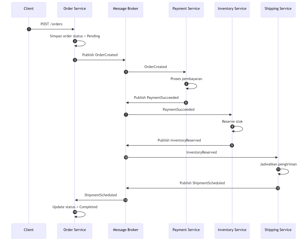 Order Servicemenerima request order, menyimpan order dengan statusPending, lalu menerbitkan eventOrderCreated.Payment ServicemendengarOrderCreated, memproses pembayaran, lalu menerbitkanPaymentSucceededatauPaymentFailed.Inventory ServicemendengarPaymentSucceeded, mencoba reserve stok, lalu menerbitkanInventoryReservedatauInventoryFailed.Shipping ServicemendengarInventoryReserved, menjadwalkan pengiriman, lalu menerbitkanShipmentScheduled.Order Servicemendengar event akhir sepertiShipmentScheduled, lalu mengubah status order menjadiCompleted.